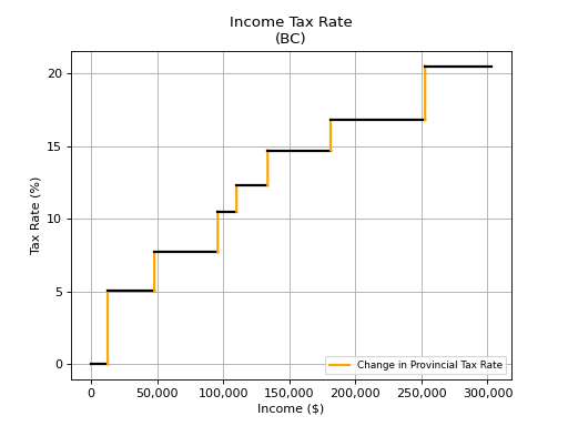 BC provincial tax rates are below in chart and tables formats. You can use the form below to select a tax year and optionally combine the federal tax rates with the provincial tax rates. The Basic Personal Amount for the tax types you select will be included by default.