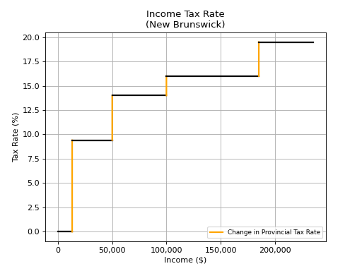 New Brunswick provincial tax rates are below in chart and tables formats. You can use the form below to select a tax year and optionally combine the federal tax rates with the provincial tax rates. The Basic Personal Amount for the tax types you select will be included by default.