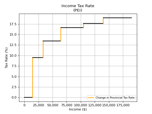 PEI provincial tax rates are below in chart and tables formats. You can use the form below to select a tax year and optionally combine the federal tax rates with the provincial tax rates. The Basic Personal Amount for the tax types you select will be included by default.