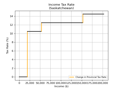 Saskatchewan provincial tax rates are below in chart and tables formats. You can use the form below to select a tax year and optionally combine the federal tax rates with the provincial tax rates. The Basic Personal Amount for the tax types you select will be included by default.